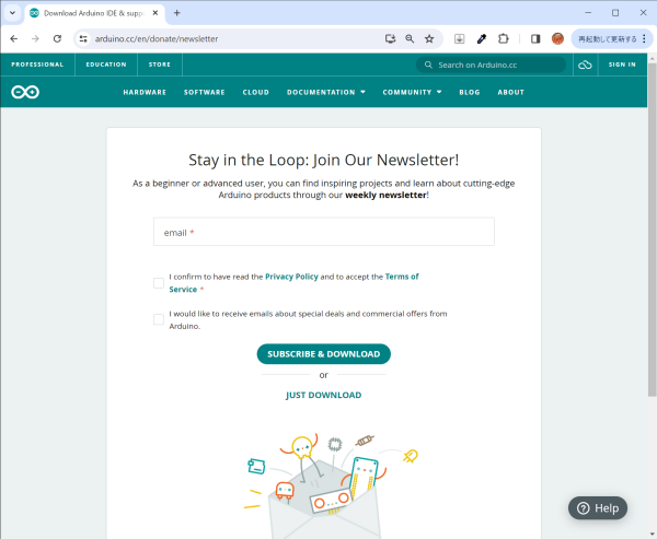 Arduino公式webサイト(https://www.arduino.cc/)にアクセスして、Arduino IDEのファイルをダウンロードします。