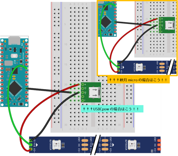 USBCpowの最大出力は3A、秋月microは1Aなのでもっと短くする必要があります。絶対にだ。